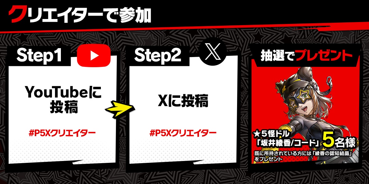 本文に「動画URL」「動画紹介文」キャンペーン用ハッシュタグ 「#P5Xクリエイター」の3点を記載してポストする。Xポストした方の中から抽選で ★5 怪ドル「坂井綾香/コード」をプレゼント。