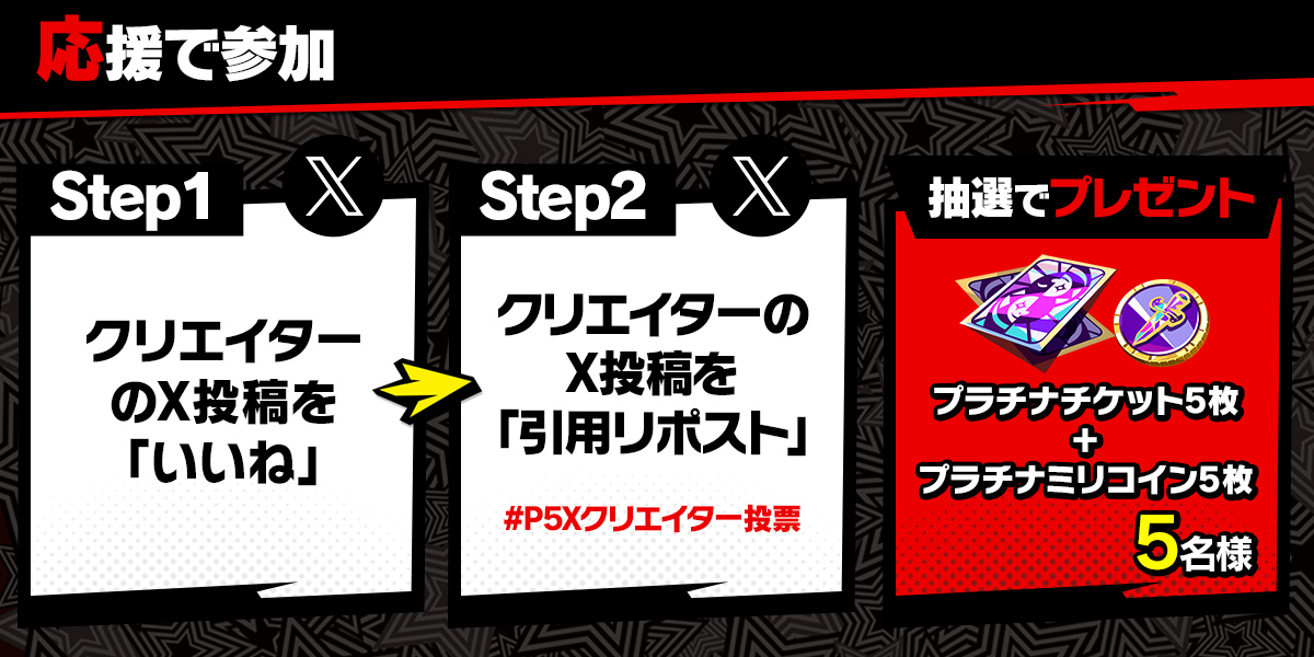 応援するクリエイターのX投稿を引用リポストする。本文に「動画の感想やおすすめポイントなどをコメント」、指定ハッシュタグ「#P5Xクリエイター投票 」の2点を記載してポストする。