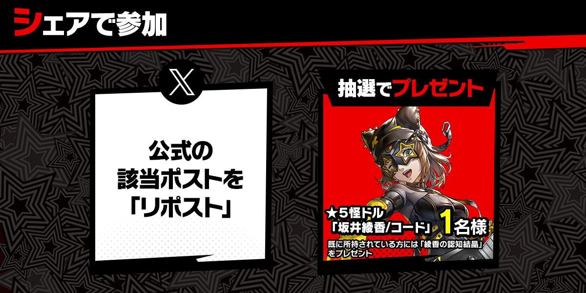 『P5X』公式Xアカウントをフォローしてキャンペーン紹介ポストを「リポスト」する。Xポストした方の中から抽選で ★5 怪ドル「坂井綾香/コード」をプレゼント。